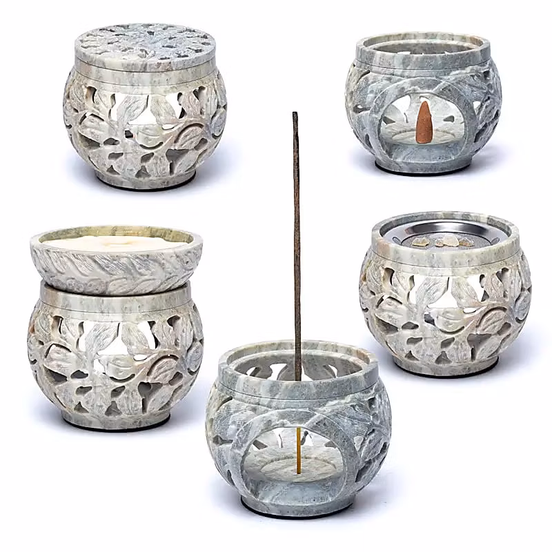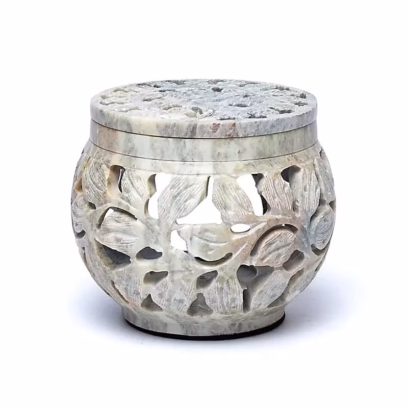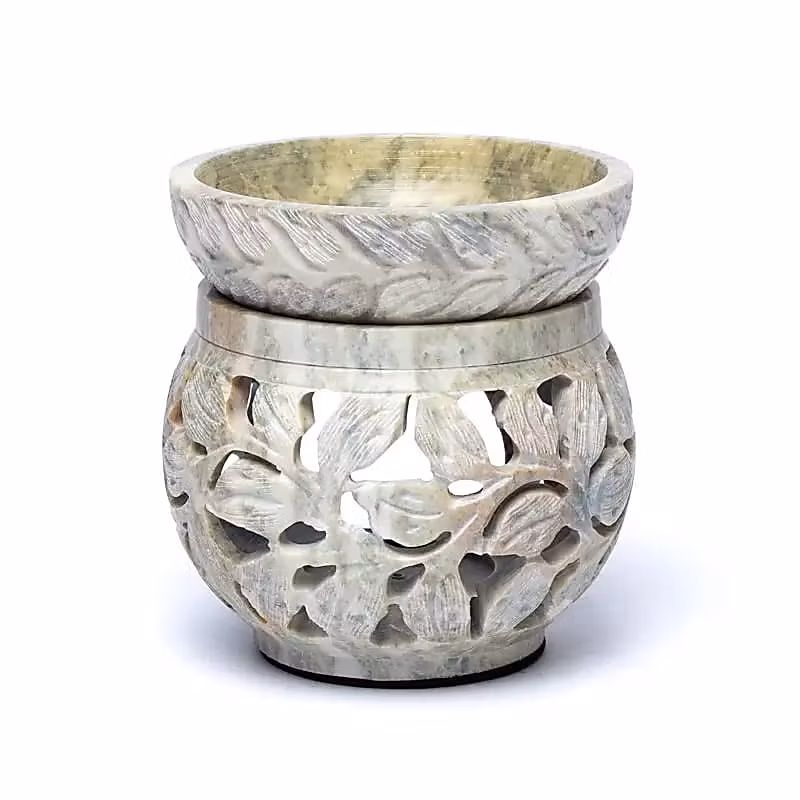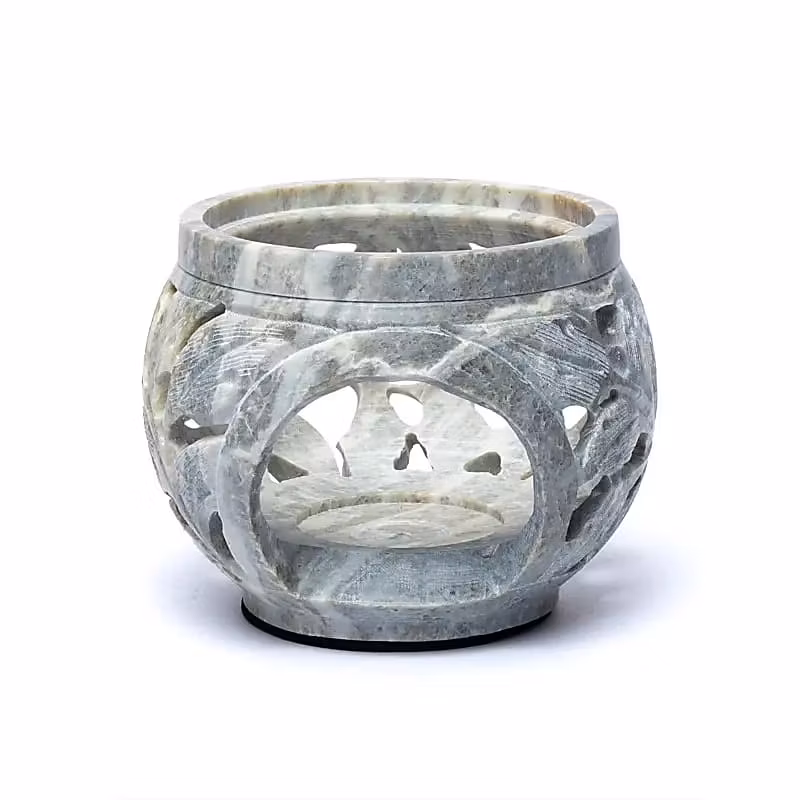 Denna vackert marmorerade aromalampa i naturlig täljsten är en mångsidig och stämningsfull detalj för dig som tycker om dofter, rökelse och ritualer i vardagen. Med sitt mjukt snidade blommönster sprider den ett levande ljusspel och skapar en lugn, harmonisk atmosfär.