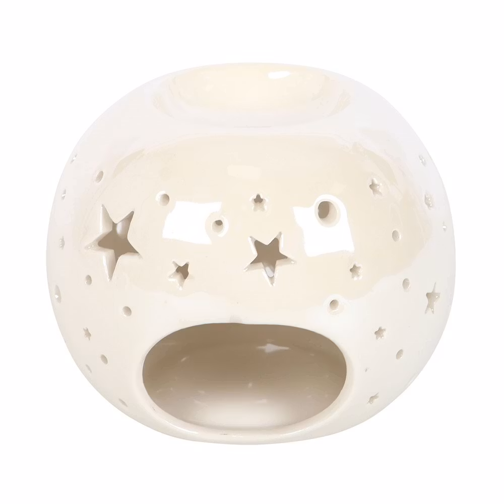 Denna vita aromalampa (oljebrännare), som även kan användas som vaxsmältare ihop med ett doftvax, skapar en mysig känsla i vilket rum som helst. Den pärlemorlika ytan skimrar vackert i skiftande ljus, och de stjärnformade utskärningarna sprider ett vackert stjärnmönster.