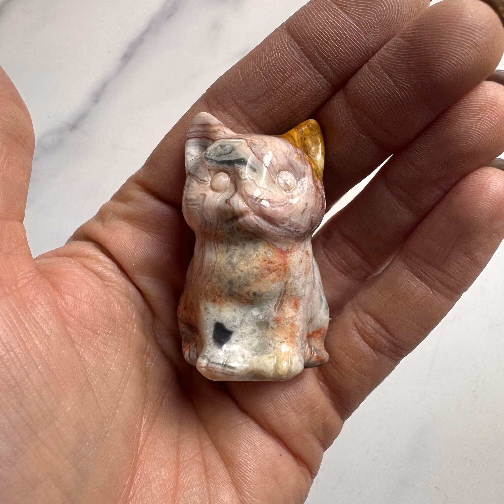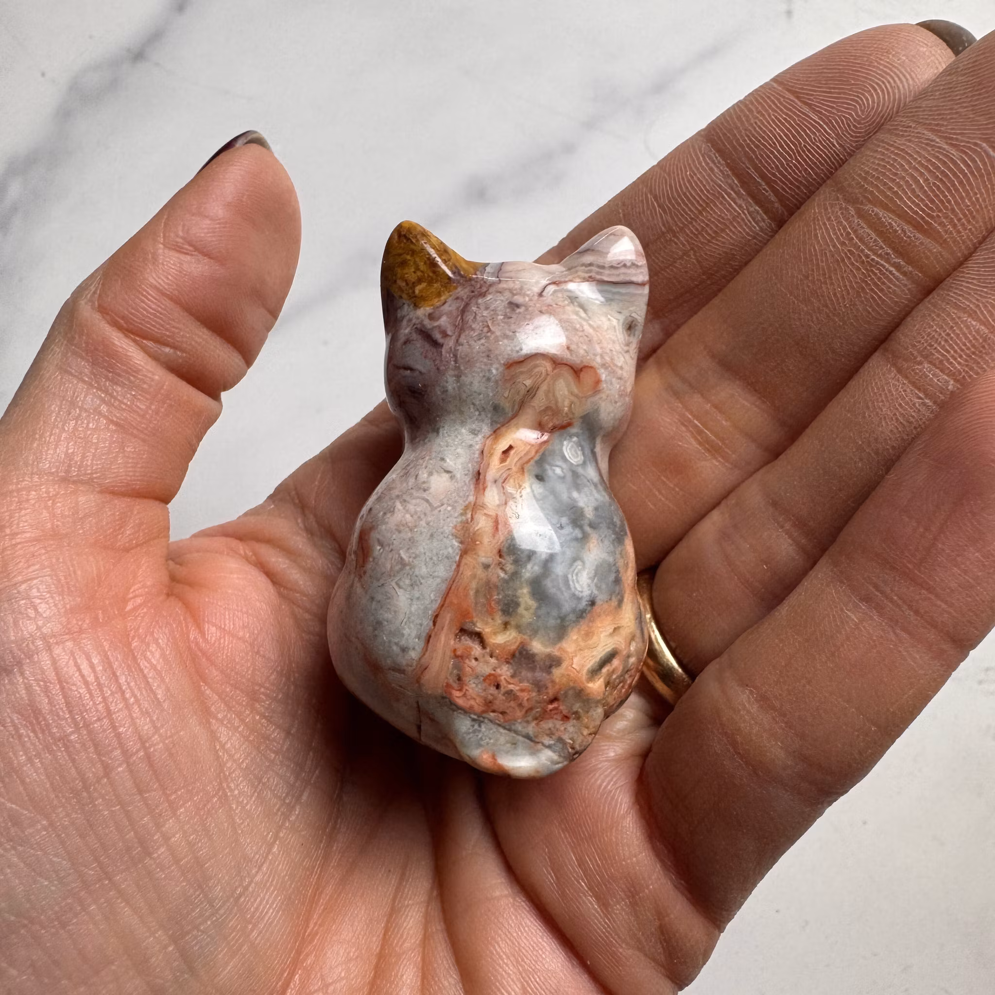 En vacker katt i Crazy Lace Agat med mjuka, rundade former och ett levande mönster i stenens naturliga bandningar. Varje figur är unik i sitt färgspel, med virvlande toner i beige, grått, vitt och ibland varmare nyanser.