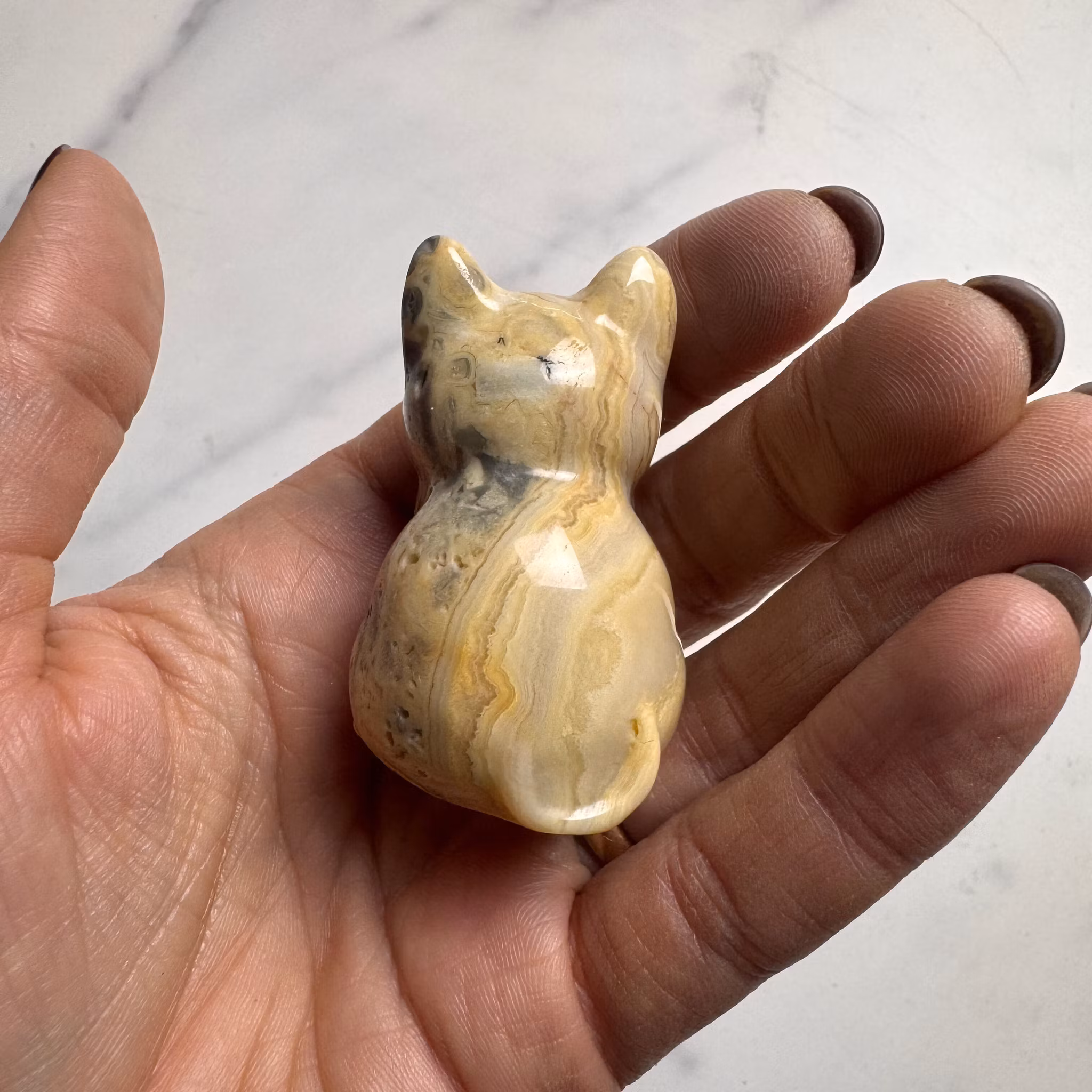 En vacker katt i Crazy Lace Agat med mjuka, rundade former och ett levande mönster i stenens naturliga bandningar. Varje figur är unik i sitt färgspel, med virvlande toner i beige, grått, vitt och ibland varmare nyanser.