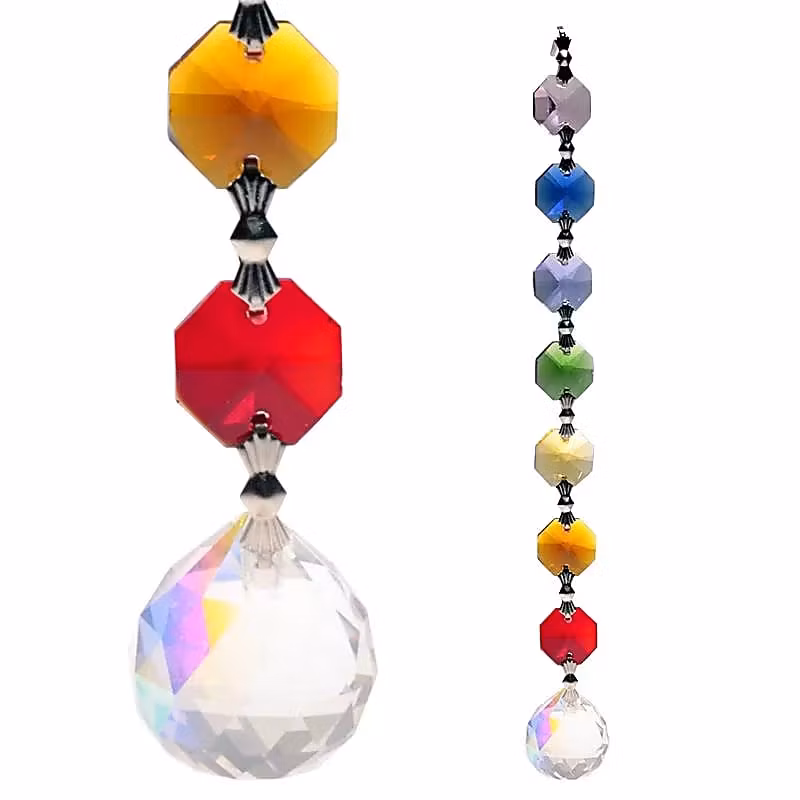 Den slipade kulan längst ner reflekterar solens strålar och skapar små ljusprismor som rör sig över väggar och golv. Ovanför sitter sju färgade kristaller som representerar kroppens sju chakran och ger solfångaren ett balanserat och harmoniskt uttryck.