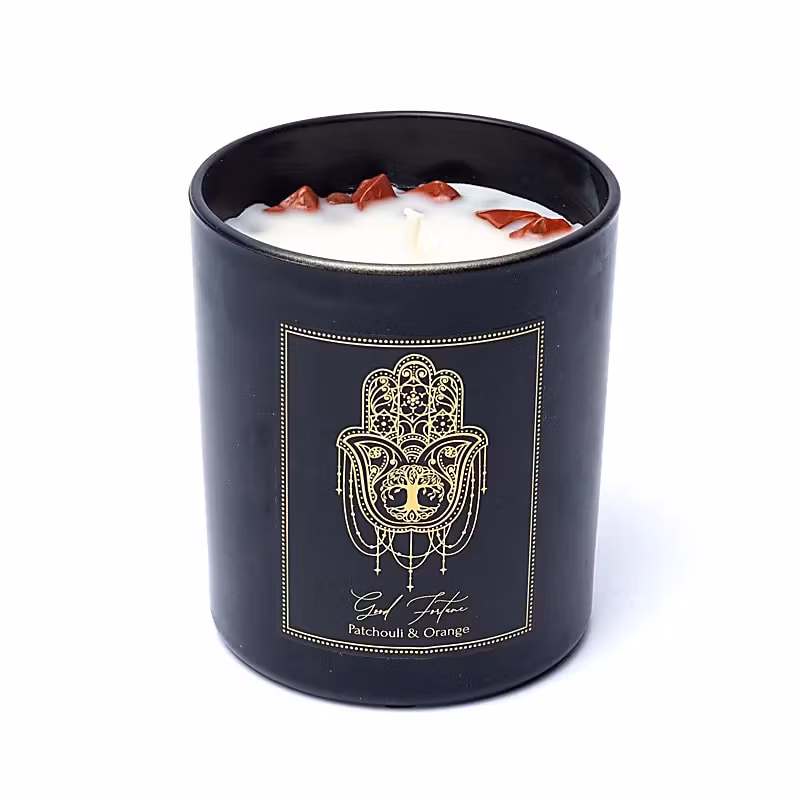 Ett kraftfullt manifestationsljus i glas, handgjutet av sojavax och palmvax. Ljuset är berikat med eteriska oljor och äkta kristaller. När ljuset brinner sjunker kristallerna långsamt med vaxet – och när ljuset är slut kan du spara och använda stenarna vidare i dina ritualer.