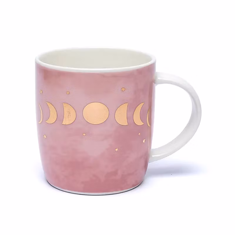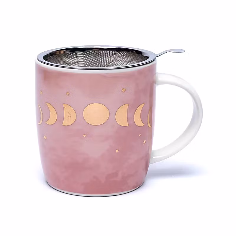 Mugg med lock och tesil. Månens faser är avbildade i guld på den rosa muggen.
