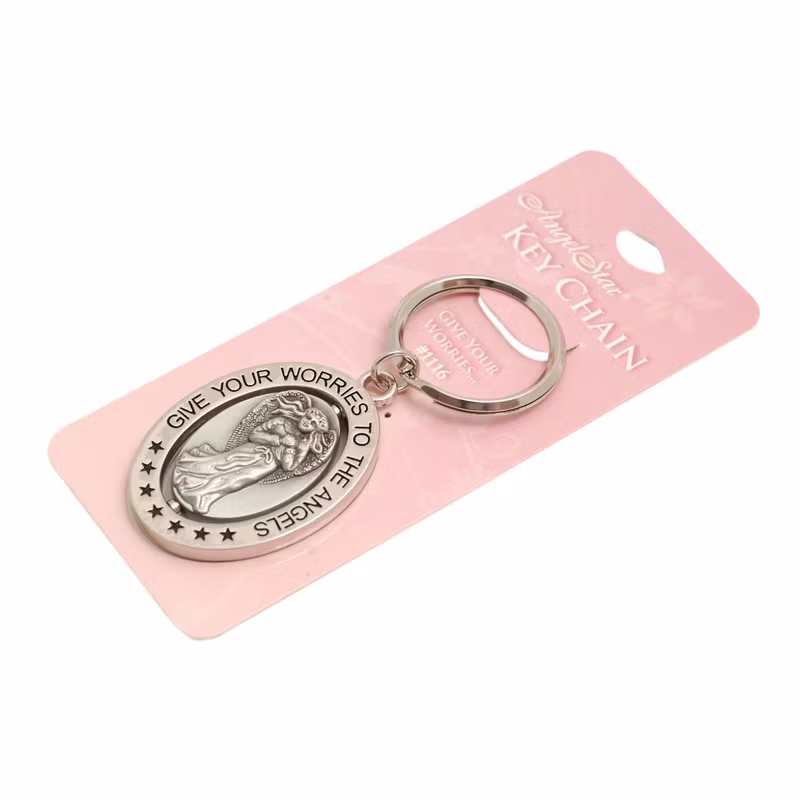Nyckelringen är cirka 5 cm och har en dekorativ ängel i mitten som kan snurra, vilket ger ett levande och mjukt uttryck.
