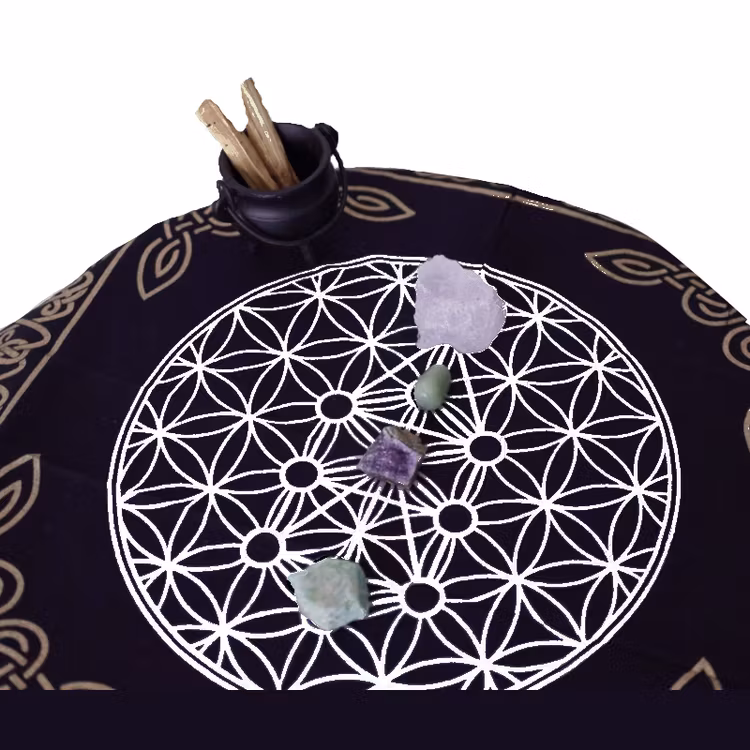 En fin altarduk med livets blomma och ett keltiskt mönster runt om. Svart med guldfärgat tryck. Fransig runt kanterna.