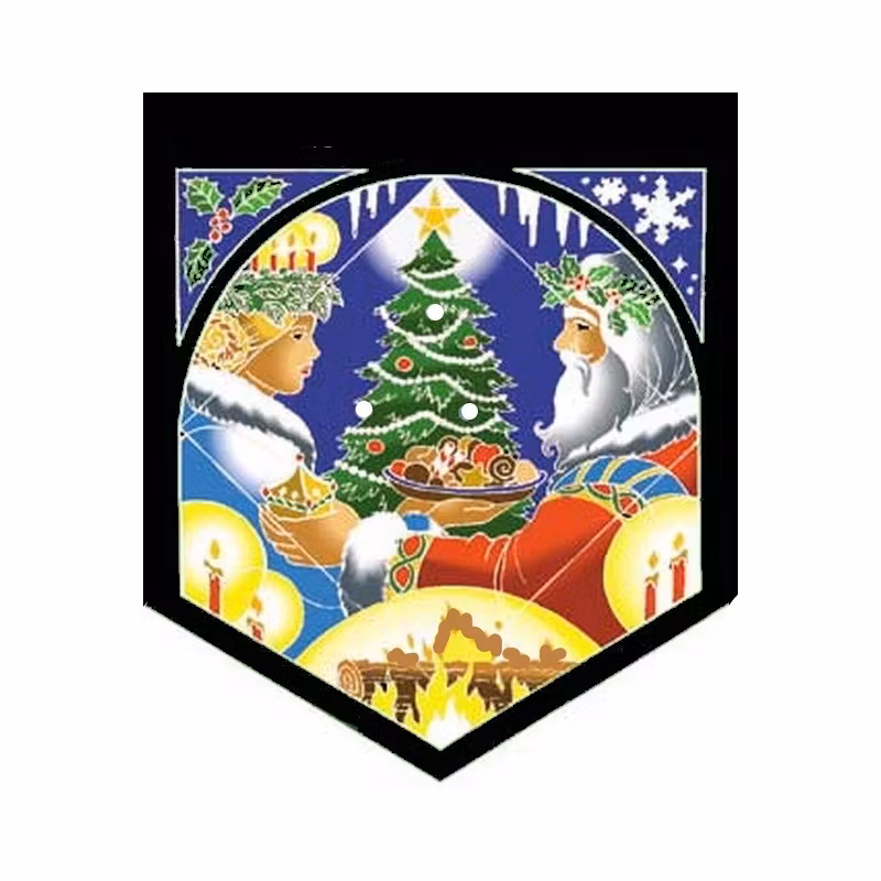 Många kulturer håller en ljusfestival för att hedra gudinnan som mamma som föder solguden. "Yule" kommer från det norrländska ordet för "hjul", och många av våra seder härrör från norska och keltiska hedniska praxis (Yule-loggen, trädet, sedvanen från Wassailing, et al). Stora julstammar brändes för att hjälpa solen att skina ljusare, och människor drack mjöd runt bålarna och lyssnade på minstrel-poeter som sjöng antika legender fram till gryningen. Den här bilden visar den kloka fader Solstice som tar med sig sina dyrbara gåvor, och Lucia, en skandinavisk gudinna som bär en ljuskrona och tar med en bricka med godsaker för att meddela det kommande ljuset. Det vintergröna trädet täckt med dekorationer och frukter påminner oss om den ständigt förnyande livscykeln. Ett Pentacle, symbol för människan pryder trädet. Detta är en bra tid för självtillväxt, överflöd, fertilitet och framför allt hopp för framtiden.