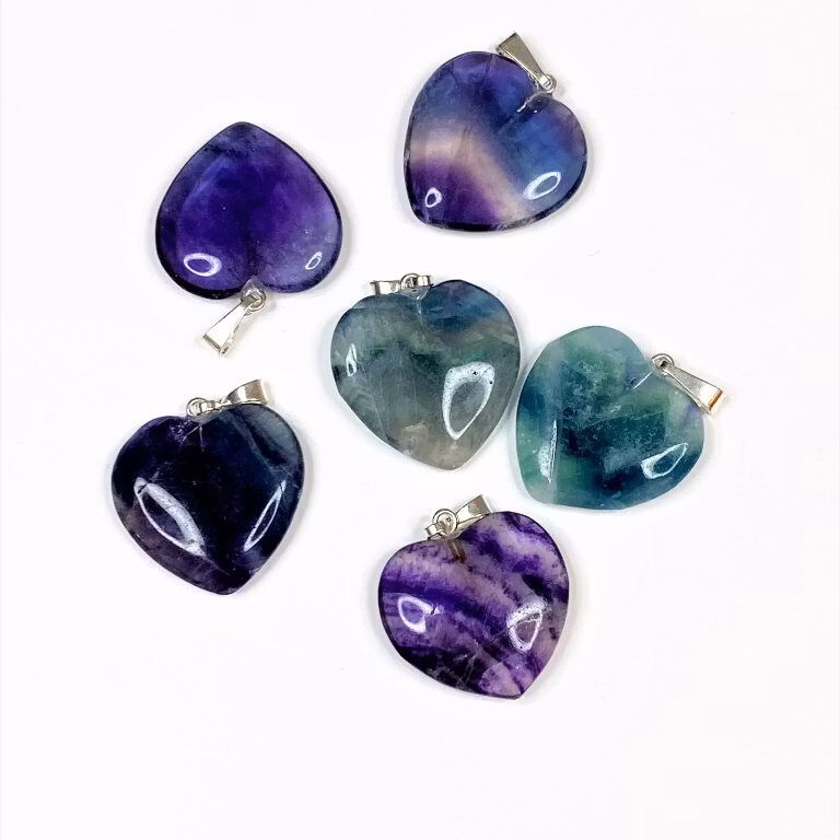 Det hjärtformade hänget är ca 15 × 15 mm och har en ögla i metallegering som är fri från nickel och bly. Ett fint val för dig som vill bära fluoritens energi nära hjärtat – som smycke, amulett eller symbol för balans och självkännedom.