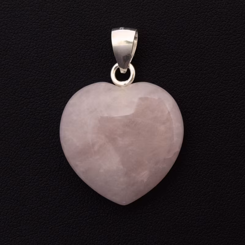 Hjärtformat hänge av Rosenkvarts. Borrat fäste av silverfärgad metall.