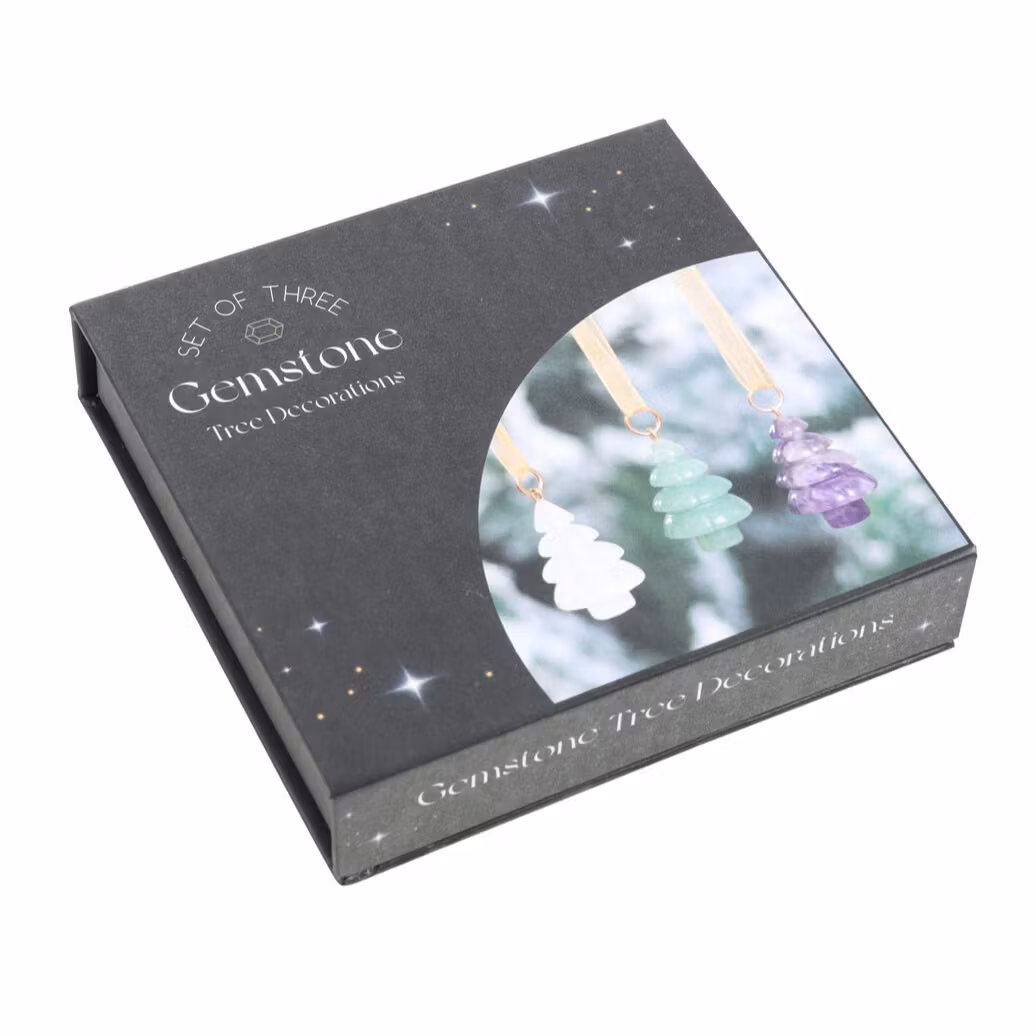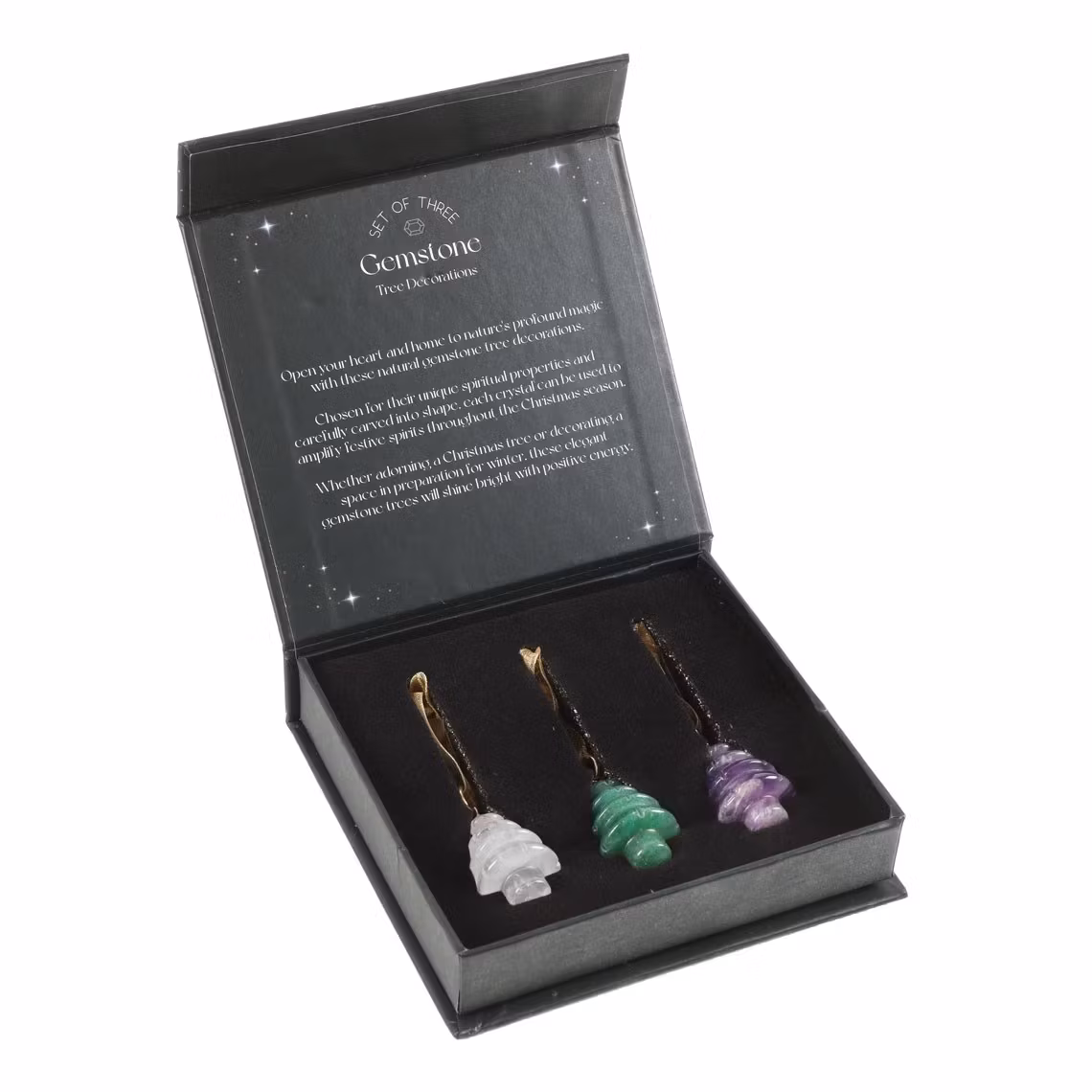 Tre otroligt vackra julgransdekorationer, förpackade i fin presentförpackning. Varje set innehåller tre små julgranar i kristall - bergskristall, grön aventurin och ametist. Varje gran är ca 3 cm hög.